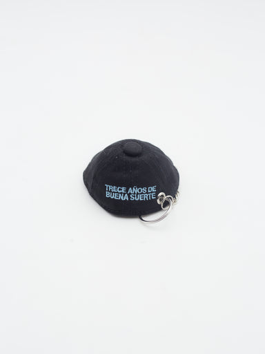 Llavero gorra cerrada de LATIGO Llavero con cadena y clip metálicos Negro y Azul Logotipo "O" bordado en el frontal, Y bordado trasero "Trece años...