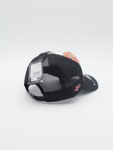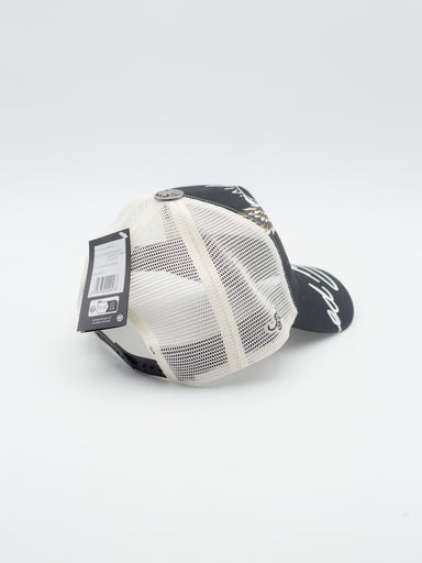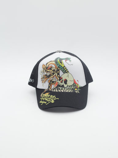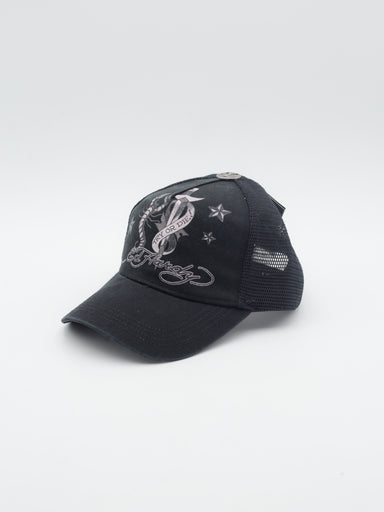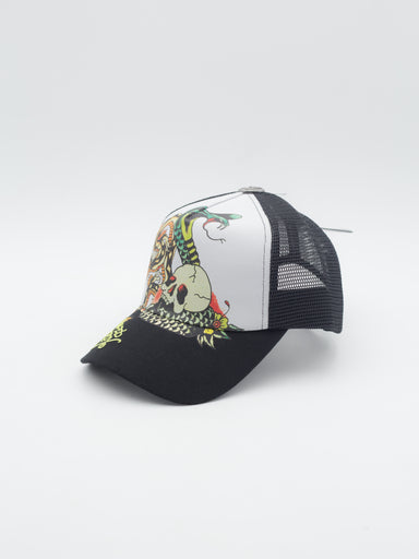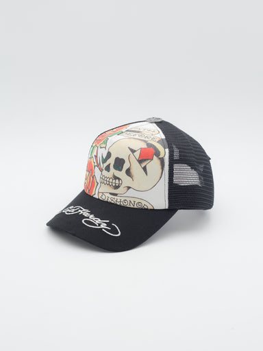 Gorra estilo trucker de la marca Ed Hardy Gorra estilo trucker de 5 paneles con estructura y visera curva Color negro y rejilla blanca Estampado...