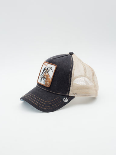 Gorra estilo Trucker con parche bordado de Goorin Bros Gorra estilo trucker con visera curva Frontal y visera denim; rejilla beige Parche borda...