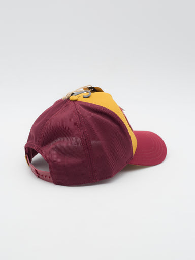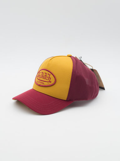 Gorra estilo Trucker con parche bordado de Von Dutch Gorra estilo Tucker con visera curva Color mostaza en el frontal, rejilla y visera roja Par...