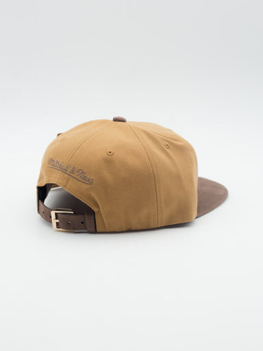 Gorra estilo strapback de Milwaukee Bucks de Mitchell & Ness Gorra estilo strapback con visera de ante vegano Corona khaki y visera marrón Log...