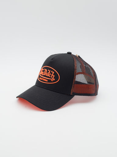 Gorra estilo Trucker con parche bordado de Von Dutch Gorra estilo Tucker con visera curva Negro con costuras y undervisor naranja neon Logotipo de...